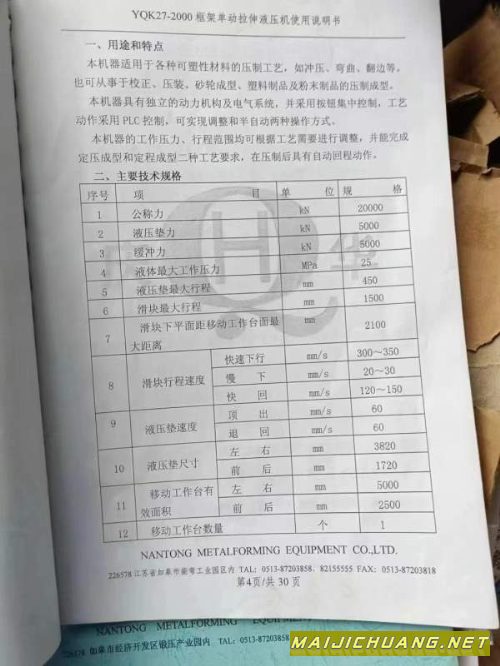 沈阳工厂内出售南通总厂2000吨框架液压机。有效台面2.5X5米,移动台多点顶出。开口2.1米,行程1.5米。自重300多吨。可遇不可求的南通总厂精品设备! 信息编号:S245074 |